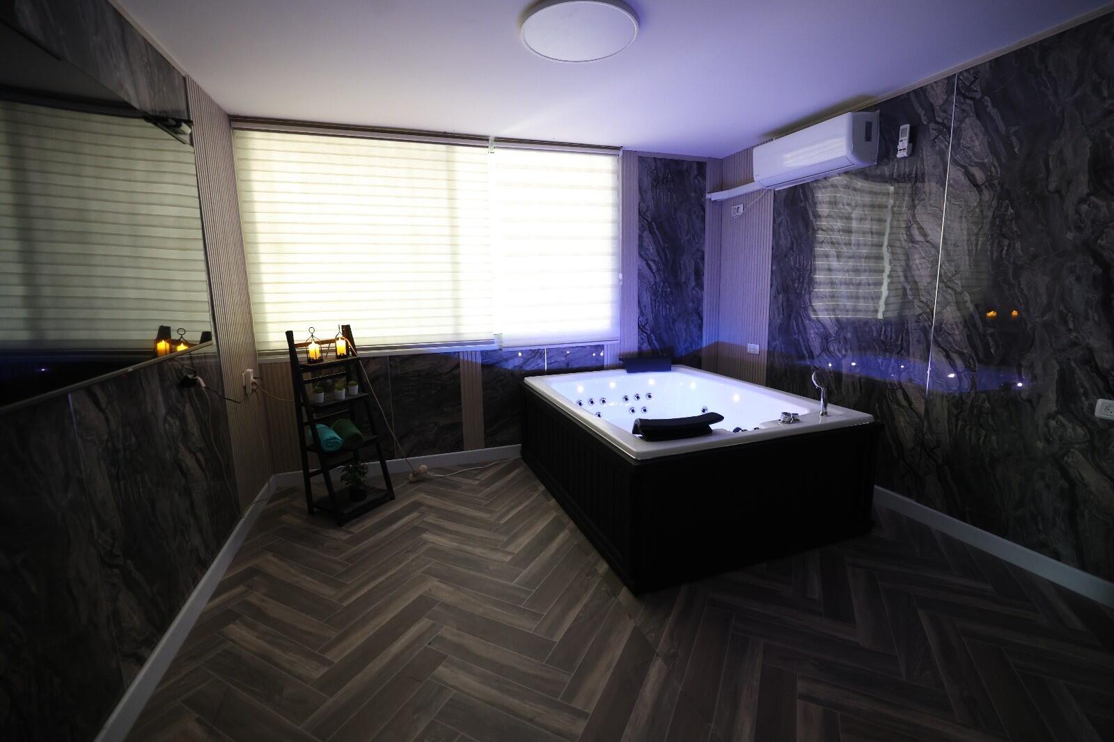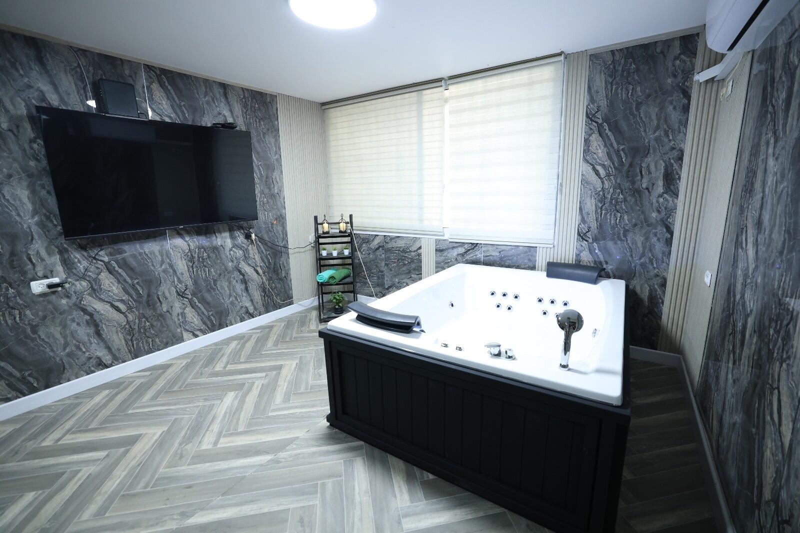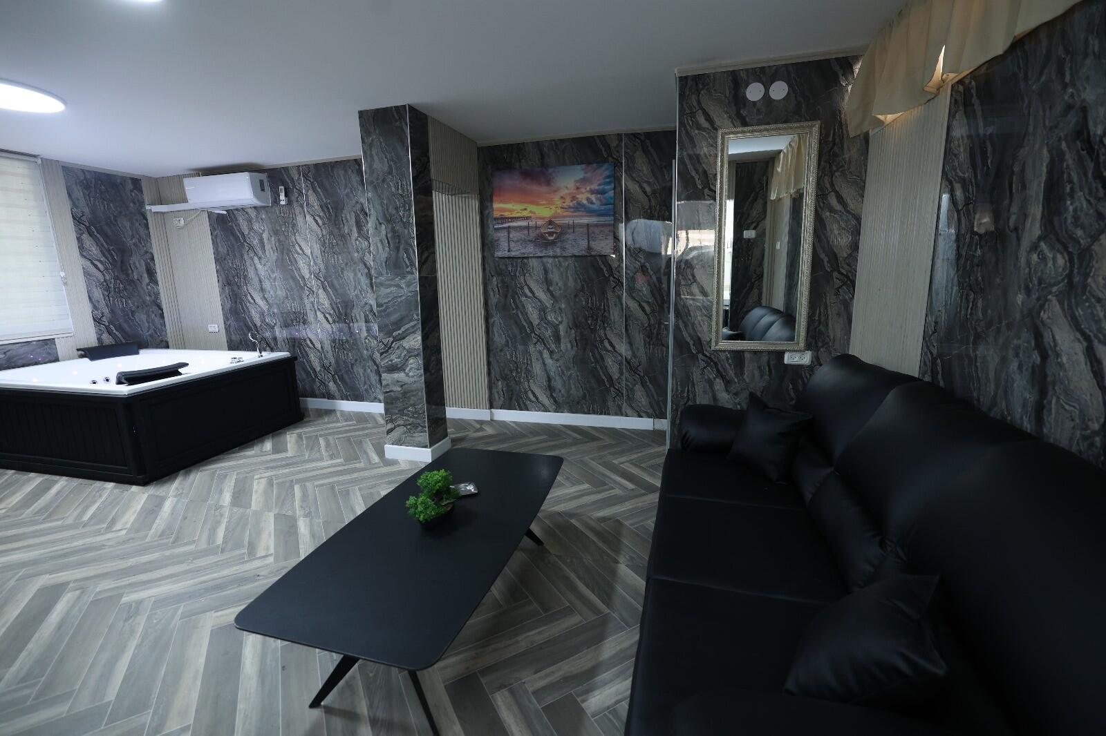 בחלל המרכזי של הסוויטה יש ג'קוזי זרמים ענק מול מסך טלוויזיה חכמה, עם ערוצים ומוסיקה לצד ספת סלון ומטבחון עם מכונת קפה, שתייה חמה ומקרר מיני בר.